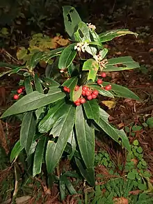 Ardisia crispa, the Japanese holly, is a species of flowering plant in the family Primulaceae.[2] It is found in the eastern Himalayas, Assam, southern China, Indochina, Taiwan, Korea, the Ryukyu Islands, and Japan, and has been introduced to Queensland, Australia, and the Windward Islands in the Caribbean.[1] An evergreen perennial shrub reaching at most 1.5 m (5 ft), it is often sold as an ornamental for its dark green leaves and longlasting red berries, much like Ardisia crenata, the Christmas berry or coralberry.[3][4][5]