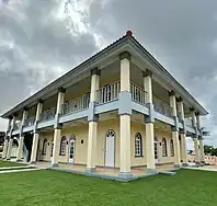 The former headquarters' architecture incorporates elements from the building styles used in the former Dutch East Indies, including encompassing covered verandas and expansive roof overhangs. Additionally, the construction displays features reminiscent of English architectural styles found in the Leeward Islands and the southern United States.