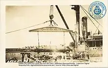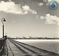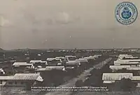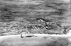 A prominent coastal point, located approximately 2 kilometres (1.2 mi) west of the Taratata Shipyard, was chosen as the site for constructing an oil pier for the refinery. In early 1928, after completing the pier and the necessary pipeline system, the first shipment of crude oil from Venezuela arrived here for storage in the tanks of Arend Petroleum Company. These tanks had also been constructed further inland. The oil pier mentioned was a steel structure that extends 400 meters into the open sea in an "F" shape. It was specifically designed to handle two large ocean tankers for transporting processed oil products, as well as two small tanker ships called lake tankers for importing crude oil from Venezuela. This configuration allows for simultaneous loading and unloading operations to take place.[3] At first, the construction personnel stayed in temporary sheds and tents on Druifbaai Beach while building the pier and refinery. As the company's residential houses were completed in the initial months, they relocated to the Eagle village situated between the factory site and Oranjestad.