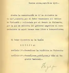 Argentine presidential decree recognizing Finland as an independent nation.