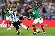 The Argentina–Mexico football rivalry is a sports rivalry that exists between the national football teams of the two countries.[2][3][4][5] Although the rivalry is not a very competitive one with Argentina holding 16 victories, 12 draws and only 4 losses in 32 meetings, the game draws a lot of attention from the media in Mexico. In fact, this rivalry is more keenly felt by Mexican supporters than Argentines, with the latter viewing Brazil, England, Uruguay and Germany as bigger rivals. A number of Argentines do not consider Mexico as rivals. Argentina has not lost to Mexico since 2004, with the last 4 meetings being shutout victories. Mexico has not scored against Argentina since 2015 in a friendly.[6]