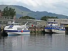 Argyll Flyer and Ali Cat in their then-new Argyll Ferries livery, at Gourock pierhead.