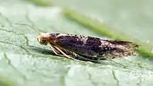 The wingspan is about 9 mm. The head is yellowish-white. Forewings are brassy-fuscous; a whitish dorsal streak, strigulated with dark fuscous; a thick median fascia and apical patch darker fuscous, with bluish reflections, separated by whitish irroration. Hindwings are grey.[2]