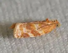 The wingspan is 12–17 mm.[4] The forewings are reddish-orange with two off-white oblique lines. The hindwings are smoky coloured. There are two generations per each year.