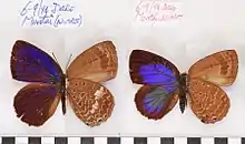 Beneath all the bands and spots are edged with a bright white on a red-brown ground. Recognizable by all the spots in the forewing being absent as far as the postmedian transverse band, except the cell-end spot; in the hindwing all the spots are very small. Above the male is deep dark blue, the female black, the basal halves of the wings with a blue gloss.[3]