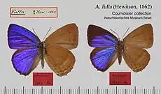 It is above very similar to canulia [now considered conspecific (described "is at once recognizable by the under surface showing no other markings but straight, slight transverse stripes in the marginal area and in the hindwing 2 discal transverse spots. Above the male is glossy lilac, the female has blackish, proximally blue forewings and violettish-blue hindwings with a very broad black margin. Philippines and Batjan. — The form sosias Fruhst. from the Molucca-Island of Obi is beneath whitish-grey instead of brownish-grey, and in the hindwing it has more distinct white -marginal dots)], but on the brown under surface the forewings is without any markings except 2 darker nebulous stripes parallel to the margin in the marginal area; also on the hindwing the discal transverse spots have disappeared except, a nebulous trace. In andamanica W.-Mas. (147 f) which is somewhat smaller and in the anal portion of the forewing much lighter, but in the marginal area of the hindwing much less brightened, the nebulous stripes beneath are still more indistinct, and the insect itself is said to be smaller. subfasciata Mr. resembles beneath again more typical fulla, but the stripes in the disc of the hindwing are absent, and the marginal dots are confined to few aint traces. — babbsi J. & T. (146 B a), from the Shouten Is., does not show any such traces at all; the marginal and basal areas beneath are almost of the same colour, separated by a broad dark shadow. - prasiae Fruhst., from Amboina, has a more intense lilac-blue upper surface than in the Andaman forms and those from uru, from where the species was originally described, separated from typical fulla by a more greyish than smoky-brown colouring beneath; the broad postdiscal band of the hindwing is bordered with yellowish instead of whitish.[4]
