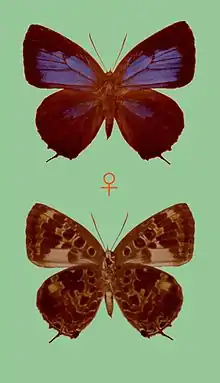 The forewing length is about 21 mm. Both sexes are very similar, above blackish-brown, the suffused with a deep dark blue reflection, the whole anal third of the hindwing purely bone-coloured, with 3 slightly contiguous transverse spots. Under surface ochreous-yellow, towards the hind-margin paler, before the marginal area a dark transverse line, in the hindwing an angular one; anal area as above.[3]The nominotypical subspecies is distributed on Bohol, Leyte, Panaon, Mindanao and Samar islands. The subspecies A. s. castagnedai is on Luzon and Marinduque islands. The subspecies A. s. negrosiana is found on Negros Island.