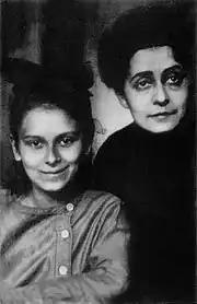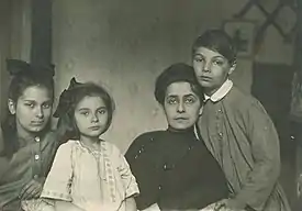 Scriabin's children were mostly raised by tutors, as both Scriabin and his wife were preoccupied with their public lives.[9] French was spoken within the family, which was frequently visited by poets, artists, theatre workers and philosophers.[10] Ariadna from an early age wrote poetry and studied at the Moscow Conservatory.[11] Julian showed talents as a composer, and Marina was trained as a painter. The house had a rich library, and the children received most lessons from private teachers and their mother.