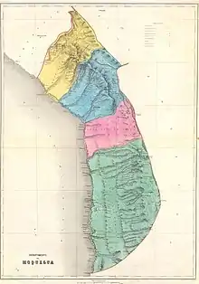Arica was established in 1823, as part of the Department of Arequipa.[3] In 1828, the capital city of the province was changed from Arica to Tacna. In 1837, the province joined the established Department Litoral with its capital at Tacna. In 1853, the province was moved to the newly established Department of Moquegua, along with the provinces of Moquegua, Tacna and Tarapacá. In 1855, the province was divided into two, forming the provinces of Tacna and Arica.