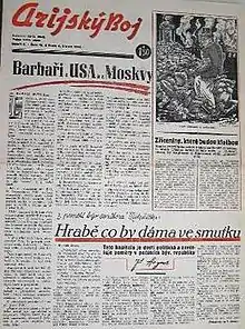 Antisemitism and fascism, as represented in the newspaper, were the fringe of opinion among Czechs, but gained in popularity after the 1938 Munich Agreement forced Czechoslovakia to cede the Sudetenland to Nazi Germany.[2][3] The paper's antecedent was another newspaper Štít národa (Shield of the Nation), which started to publish soon after the German occupation of the Czech rump state in March 1939, which established the Protectorate of Bohemia and Moravia.[4][5] Arijský boj began to publish in May 1940,[6][4] in tabloid format,[7] publishing weekly on Saturdays. Its slogan was "Proti Židům pravdou a činy!" (Against the Jews with truth and deeds).[4] Inspired by Der Stürmer, the newspaper made antisemitism its main theme.[4][7] In a letter to Emanuel Moravec, editor-in-chief Rudolf Novák stated: "Our paper spreads throughout the Czech countryside an antidote against Benešite whispered propaganda... In a reporting fashion... we expose local Jew-lovers, Benešites, and the like."[7] It was the official organ of the Vlajka Czech fascist movement.[8]