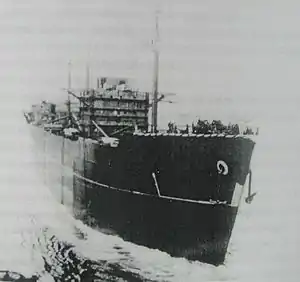 Arisan Maru was constructed by Mitsui at their yard in Tamano, Japan with the yard number 376. The freighter was completed on 22 June 1944 and owned by Mitsui Senpaku.[1] The vessel was named for a mountain in Formosa and was first assigned to transport 6,000 troops of the Kwantung Army from Pusan, Korea to Okinawa. The vessel was then ordered to transport POWs from the Philippines to Manchuria, China, or Japan. Three tiers of bunks were installed that were separated by 0.91 metres (3 ft).[3] On October 11, 1944, Arisan Maru embarked 1,782 Allied POWs at Manila, a mix of military personnel and civilian detainees. Detained Allied personnel were being evacuated from the Philippines and due to Allied air raids, they were quickly loaded onto the ship, with more people placed in the one hold than could be reasonably accommodated. Each POW was given eight five-gallon oil cans for their waste, which quickly overflowed due to a number of men afflicted by dysentery. The POWs suffered through unsanitary conditions, extreme heat within the hold (120 °F, 49 °C) and a lack of water.[4][5]