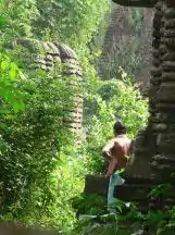 Above the doorjambs is a sukanasa which is designed after a khakhara mundi flanked by two miniature rekha deulas. Up to the gandi portion the temple is carved with series of khakhara mundis inserted in every paga. The jangha portion is decorated with series of stylised chaitya motifs and bada is relieved with scrollwork. The doorjambs measure 1.4 metres in height and 0.95 metres in width and are decorated with three plain vertical bands. The lintel is plain.