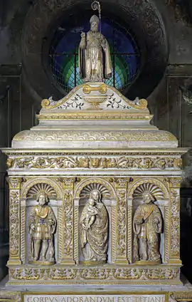 In 1490, during the episcopate of Paolo Zane, the abbess of the nunnery had a revelation of the burial place of the relics. According to legend, the subsequent excavation proved her dream to be precise.[1] The saint's sarcophagus was probably not the original, but likely dated to the 12th century. The idea of a new monumental ark for the relics then came about, and within fifteen years, the funerary monument was installed in the chapel on the left of the presbytery of the Cosma and Damiano church. An inscription MDV (1505) appears on the base, indicating the date of installation. The translation of the body of the saint is also recorded in the Brescian state archives. The tomb was ostensibly subject to some further work, as MDXXIX (1529) appears on the back of the moulding. The extent of the works, however, is questioned.[2]