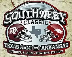 The Arkansas–Texas A&M football rivalry is an American college football rivalry between the Arkansas Razorbacks and Texas A&M Aggies, which started in 1903. Between 1992 and 2008, the schools did not play each other when Arkansas left the Southwest Conference to join the Southeastern Conference. The rivalry was renewed as a neutral-site out-of-conference contest (and branded as The Southwest Classic) in 2009; in 2012 it once again became a conference rivalry when Texas A&M also joined the Southeastern Conference. Arkansas leads the series 42–35–3.[2][3]
