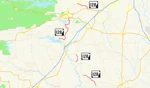 The original Highway 128 was created in 1928, from Highway 27 southwest of Murfreesboro southwest to Highway 24 (now US 371).[16] In 1937, Highway 128 became part of Highway 26, and State Road 7A between Holly Springs and Pine Grove was renumbered as Highway 128.[17] Highway 128 was extended later.