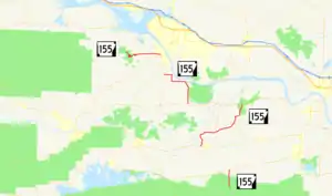 Arkansas Highway 155 (AR 155 and Hwy. 155) is a designation for four state highways in Arkansas. The northernmost segment of 7.10 miles (11.43 km) runs from Mount Nebo State Park to AR 22 in Dardanelle.[1] A second segment in Yell County of 7.56 miles (12.17 km) connects Highway 7 and Highway 154.[2] A third segment runs 11.16 miles (17.96 km) from AR 10 near Casa to Petit Jean State Park.[3] The fourth segment is a 2.68-mile (4.31 km) spur from Highway 60 south to an area near Deberrie.[4]