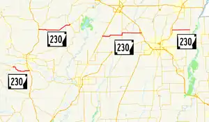 Highway 230 was first authorized by the Arkansas State Highway Commission (ASHC) on July 10, 1957 between Cave City and Strawberry.[2][3] A second route was designated between Alicia and Bono on June 23, 1965,[4] with a third highway created between Brookland and Dixie on January 12, 1966.[5] The final section was created on April 26, 1978 when Highway 14 was rerouted onto Highway 25 toward Batesville. Highway 230 replaced the Highway 14 designation between Locust Grove and Southside.[6]