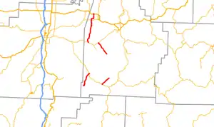 Highway 295 (AR 295, Ark. 295, and Hwy. 295) is a designation for four north–south state highways in Madison County. One segment of 5.50 miles (8.85 km) runs from the Ozark National Forest north to Highway 16 at Crosses.[3] A second segment of 3.07 miles (4.94 km) runs northeast from Combs to Madison County Road 4554 (CR 4554).[3] The third segment runs 4.71 miles (7.58 km) north from CR 5395 at Japton through Georgetown to Highway 74 at Drake's Creek.[3] A fourth segment of 10.88 miles (17.51 km) begins at Highway 74 at Wesley and runs north to US Route 412 (US 412).[3]