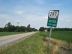 The southern section of Highway 297 is a spur route which connects Dyess to the highway system. It begins at Highway 14 north of Dyess and heads south. Near its halfway point, the highway crosses the Tyronza River and then passes through the center of Dyess. One half-mile (0.8 km) south of the town center, the designation ends where the pavement ends. It continues south as Mississippi County Road 139.[2]
