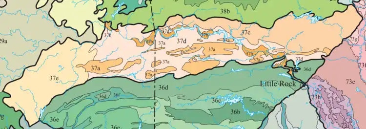 The Arkansas Valley Hills ecoregion is underlain by Pennsylvanian sandstone and shale, and is lithologically distinct from Ecoregions 37b and 39. Ecoregion 37c is more hilly than the Arkansas Valley Plains (37d) and less rugged than Ecoregions 36, 37a, and 38. Ultisols are common and support a potential natural vegetation of oak–hickory forest or oak–hickory–pine forest; both soils and natural vegetation contrast with those of Ecoregion 37b. Today, pastureland is extensive, but rugged areas are wooded; overall, trees are much less extensive than in neighboring Ecoregions 36d, 37a, and 38 but more widespread than in Ecoregions 37b and 37d. Poultry operations, livestock farming, and logging are important land uses. The region covers 2,771 square miles (7,180 km2), entirely within Arkansas.[3] Preserved examples of the ecoregion include Cove Creek Natural Area and Woolly Hollow State Park in Faulkner County and Big Creek Natural Area in Cleburne County.