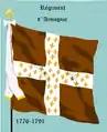 The other colours for the infantry regiments were ordnance flags (Drapeau d'Ordnnance) for each company. The designs for all of these flags were based on a large white cross centred on the colour, dividing the flag into four quarters, these then bearing a particular design for each regiment.[16]