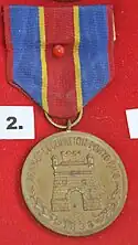 The Army of Puerto Rican Occupation Medal is bronze 1 1/4 inches wide. It has an oxidized matte finish in relief. The obverse of the medal bears a castle in the center with two small round towers at the corners. This obverse is also used on the obverse of the Spanish Campaign Medal. At the top around the outside of the medal is the inscription ARMY OF OCCUPATION OF PORTO RICO (the "Puerto Rico" of the country was spelled using conventions of the time). The date 1898 appears at the bottom. On the left side of the date is a branch of a tobacco plant on the other side is a stalk of sugar cane. The reverse depicts a spread eagle on a trophy consisting of a cannon, six rifles, four standards, an Indian shield, quiver of arrows with three spears, a Cuban machete, and Sulu kris. Below the trophy are the words FOR SERVICE. The reverse is circumscribed by the words UNITED STATES ARMY at the upper half and thirteen five-pointed stars in the lower half. The ribbon is 1 3/8 inches wide in ultramarine blue. At the edges are stripes of old glory red 1/16 inches wide. In the center is a 3/8 inch stripe of old glory red bordered on both sides by 1/16 inch golden yellow stripes.[5]