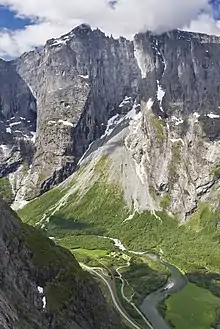 Heen is known for several first ascents, and his many ascents of Romsdalshorn, including the first winter climbing of the mountain. He was Norway's leading mountaineer from the 1920s to the 1950s.[5][6][7] Heen was largely autodidact in mountaineering, and an unconventional outsider to a sport defined by Norsk Tindeklub in Oslo's western suburbs.[8] He did not have a single accident during his life in the mountains.[4] In 1926 he climbed solo (alone) the south wall of Romsdalshorn, at the time a groundbreaking achievement. Heen had several times attempted Trollryggen, a 2 kilometer long pillar at the edge of Trollveggen. One attempt was in the summer of 1940 with Arne Næss. In 1958 he finally succeeded together with Ralph Høibakk, their only equipment was rope, 10 pitons, 6 carabiners and a hammer each. Ten years later, with improved equipment, the two climbed the route in only 10 hours.[8] In 1984 he was one of the guides for Carl Boenish and his wife during their BASE-jumping in the area.[9]