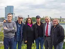 Press conference at rally regarding the 20th anniversary of "Arsch huh, Zäng ussenander" at Cologne Hotel Maritim with view at event area "Deutzer Werft": Karl-Heinz Pütz (organizer), Wolfgang Niedecken (musician), Monika Piel (director of WDR and chairwoman of ARD), Peter Brings (musician), Jürgen Roters (city mayor of Cologne), Tommy Engel (musician)