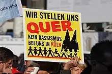 "Wir stellen uns quer. Kein Rassismus bei uns in Köln!" (English: "With us no racism in Cologne!") poster on 20 September 2008