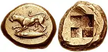 Coinage of Hellespontine Phrygia at the time of Artabazos I, Kyzikos, Mysia. Circa 500-450 BC. This type of electrum coins was treated as gold coinage, and competed alongside Achaemenid Darics.[4]