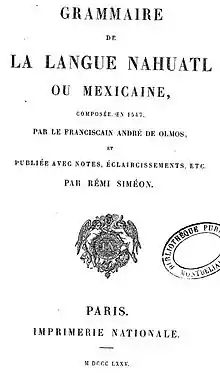 1. Andrès de Olmos (1875), Grammaire de la langue Nahuatl ou Mexicaine, Paris: Impr. Nationale