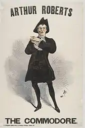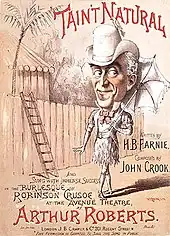 In the legitimate theatre, he starred as Dr. Syntax in the Drury Lane Theatre pantomime Mother Goose (1880); as Mrs. Crusoe in Robinson Crusoe (1881 and 1886); in Sindbad the Sailor (1882; a show he repeated in 1906); in H. B. Farnie's Nell Gwynne (1884); in Farnie's The Grand Mogul (1884 with Florence St. John, Fred Leslie and Frank Wyatt);[9] Joe Tarradiddle in the English adaptation of Offenbach's La Vie parisienne; Stanley the explorer in the 1891 Gaiety Theatre burlesque of Joan of Arc by Adrian Ross and J. L. Shine,[10] popularising the song "I went to find Emin"; in the early Edwardian musical comedy In Town (1892); Captain Arthur Coddington in the Gaiety burlesque of Don Juan (1893, by Meyer Lutz, A. C. Torr and Ross); Claude Du Val (1894), the title character in Gentleman Joe (1895); Black-Eyed See-Usan; and Dandy Dan the Lifeguardsman (1898), among others. Roberts had success in the 1890s with the hit song "Daddy Wouldn't Buy Me a Bow Wow".[11]