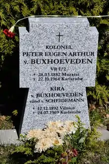 In 1939, he moved to Germany and died in Karlsruhe in 1964. On 12 September 2014, the ashes of von Buxhoevden and his wife Kira (née Scheidemann) were buried in the Defence Forces Cemetery of Tallinn.[1]