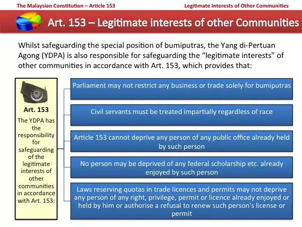 The two diagrams below summarise the provisions of Article 153. The first shows how Article 153 deals with the special position of Malays and the natives of Sabah and Sarawak (collectively, "bumiputras") and the second shows how it deals with the legitimate interests of the other communities.