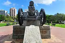 Artillery Memorial, Cape Town was erected in memory of the gunners who fought for South Africa during World War I. The memorial, which forms part of the Delville Wood Memorial, is located in the Company's Garden, Cape Town, and was strategically established to commemorate South Africa's artillery soldiers who fell in battle.[1] Of those who volunteered to fight during the war, 5800 were white South African, amongst whom 15% were Dutch and 85% English. An estimated 2536 of these men were killed in the Deville Wood battle in Europe. The Artillery Memorial, an authentic cannon facing east towards the National Gallery, proudly honors South Africa's heavy artillerymen. Inscribed on it are the names of the officers, N.C.O.'s and men of the South African artillery who fell in the Great War (1914–1918).[2]