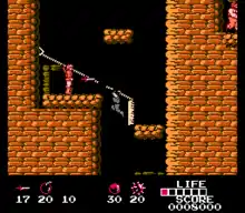 The protagonist uses a grappling hook to climb up to the platform. The "LIFE" meter, the "SCORE" counter and a range of weapons are displayed on the bottom of the screen.