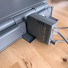 An Asante Micro EN/SC Ethernet adapter connected to the back of a PowerBook 145