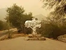 The Ash Mountain Entrance Sign at Sequoia National Park was constructed in 1935 by Civilian Conservation Corps craftsmen. Featuring a carved Native American face, the sign was made from blocks of sequoia wood and fastened with wrought iron brackets.[2]