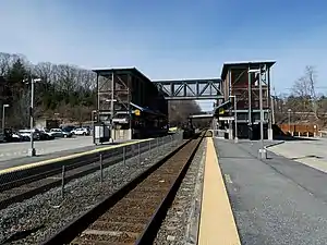 (second page) - ↑ Saltzman, Jonathan (August 11, 2002). "New stations popular with commuters: Town's rail stop will open Aug. 24". Boston Globe. p. 111 – via Newspapers.com.