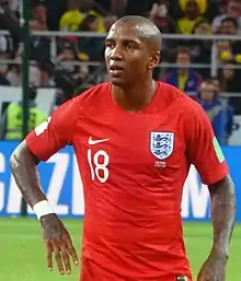 Young was named in Southgate's 23-man squad for the 2018 FIFA World Cup.[99] He was England's first-choice left-back in Russia, playing the entirety of their first two group matches against Tunisia and Panama.[100][101] With qualification for the knockout stage secure after winning both matches, Young was rested for the final game against Belgium,[102] before returning for the round of 16 tie against Group H winners Colombia. That match went to extra time, but Young was replaced by Danny Rose 12 minutes into the additional period and played no part in the penalty shoot-out after the match finished as a 1–1 draw.[103] England won 4–3 on penalties and progressed to a quarter-final against Sweden, against whom Young again played the full 90 minutes as England won 2–0, with Young providing the assist for Harry Maguire's opening goal from a corner.[104] In the semi-final against Croatia, Young again started the match, but was again replaced by Rose at the start of extra time, with the score at 1–1 after 90 minutes.[105] England ultimately lost the match 2–1 after extra time, and Young did not play in the third-place play-off against Belgium.[106]