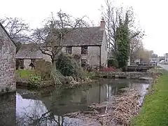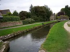 The river forms two channels making a large square in the parish, enclosing the western half of the village and in the past powering mills of a modest nature.[31] The south-western channel is joined by the Swill Brook and smaller tributaries join, particularly at the re-convergence of the channels. The Thames' north-eastern channel, the village channel, is deeply entrenched at the places it has frontage to more than 30 of the village's homes and where it is crossed by many flat-deck bridges, some of brick or stone arch. One public bridge, Gumstool Bridge, is not quite flat.[32] Made of limestone it is "probably medieval"; it has two arches, vertical sides rising to form a parapet 80cm high, triangular copings and a raised, squared apex.[32] Two other bridges are consistent with a slightly pre-1800 date.[33] The manor house and adjacent church farm enjoy the vestige of a moat, its southern limb; the rest was intact for many centuries, as seen in maps of the 19th century.