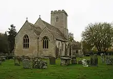 The Church of England parish church of the Holy Cross has stood since the late 12th century at what is now on the northwest edge of the village. Of coursed limestone, it has a west tower, nave with narrow aisles, and chancel with north chapel.[16] It was altered in later centuries, and restored to designs by William Butterfield in 187677 yet it retains early features: the north arcade was built in two phases from the late-12th century to the mid-13th after the south arcade built around 1200. The chancel arch has three carved orders; Butterfield made this wider and taller but keeping stonework from the late 12th century.[17]