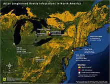 In North America, established populations were first discovered in August 1996 in Brooklyn, New York and has since been found in other areas of New York, New Jersey, Massachusetts, Illinois, Ohio, and Ontario in Canada.[7] However, it has also been eradicated from some regions within these states and provinces.[2][8][9][10][11][12] The first confirmed detection in South Carolina was June 4, 2020, at a residence in Hollywood, Charleston County. As a result both Clemson University's State Crop Pest Commission (which regulates crop pests for the state government) and the federal APHIS declared a quarantine.[13][14][15][16][17]