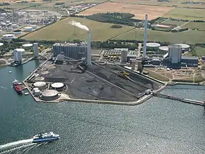 The Asnæs Power Station (Danish: Asnæsværket) is a woodchip power plant operated by Ørsted A/S in Kalundborg, Denmark. It consists of three active units, which deliver 147 MW (Unit 2), 270 MW (Unit 4) and 640 MW (Unit 5). Unit 3 went in service in 1959 and uses a 152.1-metre-tall (499 ft) flue gas stack, while Unit 5, which went into service in 1981, uses a 220.1-metre-tall (722 ft) flue gas stack, the third tallest in Denmark. Its two 60m high coal cranes were dismantled in 2016.[1]