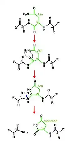 The cleavage mechanism consists in the cyclization of the asparagine, assisted by other active site residues. In certain conditions, the asparagine cyclic structure nucleophilically attacks its C-terminal peptide bond to the main chain forming a new bond to create a stable succinimide, cleaving itself from the main chain and consequently releasing the two halves of the product.[6][7]