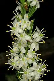The plant produces white flowers, which, like the leaves, grow in clusters.[2] They have three sepals and three petals, which are similar in appearance. The six white filaments have yellow anthers.[4] Flowers are present between August and December.[2] The colour and the scent of these flowers attract insects, which pollinate the flowers.[4]