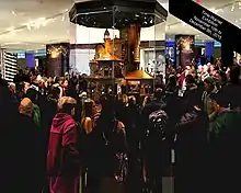 The Astolat Dollhouse Castle was acquired by collector L. Freeman in 1996 and moved to the Nassau County Museum of Art.[18] Freeman is an avid collector of dollhouses and since her acquisition of the Astolat Dollhouse Castle she has continually upgraded its interiors with additional one-of-a-kind antique miniatures, tiny antique furniture, and paintings in addition to those that already existed within the structure.[6][31][32][33] There are reportedly now about 30,000 miniatures pieces in the Astolat Dollhouse Castle collection, but only about 10,000 are displayed at any one time.[5][17] The inventory is rotated.[34] The Astolat Dollhouse Castle was on rare public display at the Time-Warner Center at Columbus Circle, New York City from 12 November to 8 December 2015. All proceeds from this exhibition benefited charities for children, including St Jude's Children's Hospital,[35] Orphans International,[36] and others.