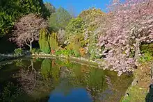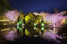 The gardens encompass 14 acres (5.7 ha) of rolling terrain along Remutaka Stream and were created in the late 1990s, formerly known as the "Kaitoke Country Gardens". The area was transformed from bare paddocks with only a few trees to a mature garden with around 400 cherry blossom trees, rhododendrons, and other flowering plants, a garden maze and two ponds connected by a small waterfall.[2] The loosely Japanese-inspired garden holds its annual "Blossom Valley festival" every spring when the cherry blossom trees are in flower, typically from mid September to early October. At that time of the year, the garden is also open in the evenings and lit up after dark, in particular the cherry blossom trees.[3]