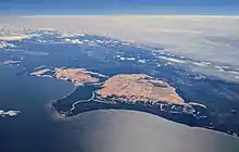 Lake Athabasca (data date June 9, 2002):[7] the ice is light blue, dark blue is open water and the sand dunes located within the park on the south shore are white.