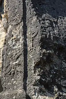The right arm of the figure is raised and holds a lance. Her left, pointing down to the ground, holds a shield on edge. The lance rests on a column, which connects directly to the left pilaster. A snake winds around the lance and column, with its lower end reaching along the ground to Athena's feet. The head and mane of a bridled horse can be seen above the shield and left arm of the goddess and its hindquarters disappear behind her right arm. On the right pilaster there is a star, a crescent moon and a thunderbolt to be seen. Between the moon and the thunderbolt, traces of a servered head can be made out. Similar traces are found to the left of the left pilaster, which is itself undecorated. To the right of the righthand limit of the image, a symbol has been engraved, consisting of a stand with two crescent moons on top and a ball with star. Serra Durugönül, who investigated the Cilician rock reliefs in the 1980s, thought this was a candelabrum, that is a cult object, to be interpreted as a simplified depiction of a Jewish menorah.